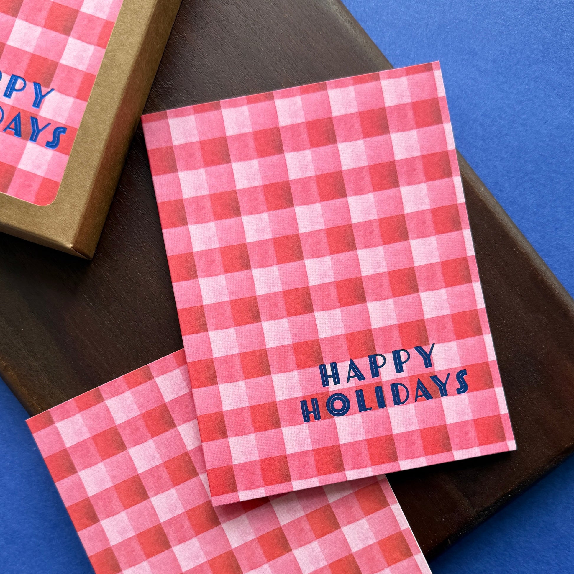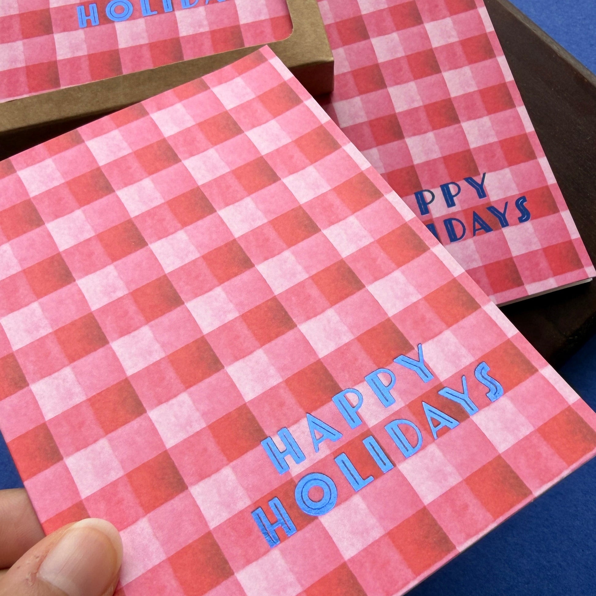 Beautifully designed blank holiday cards featuring a bright pink and red gingham pattern. The electric blue foil 'happy holidays' caption adds the perfect touch for Christmas and Hanukkah, while the inside of the holiday card is blank, with space for you to add your own warm wishes. The holiday card box sets are packaged in recyclable cardboard, while the individual cards are supplied in cello bags or can be supplied naked on request.
