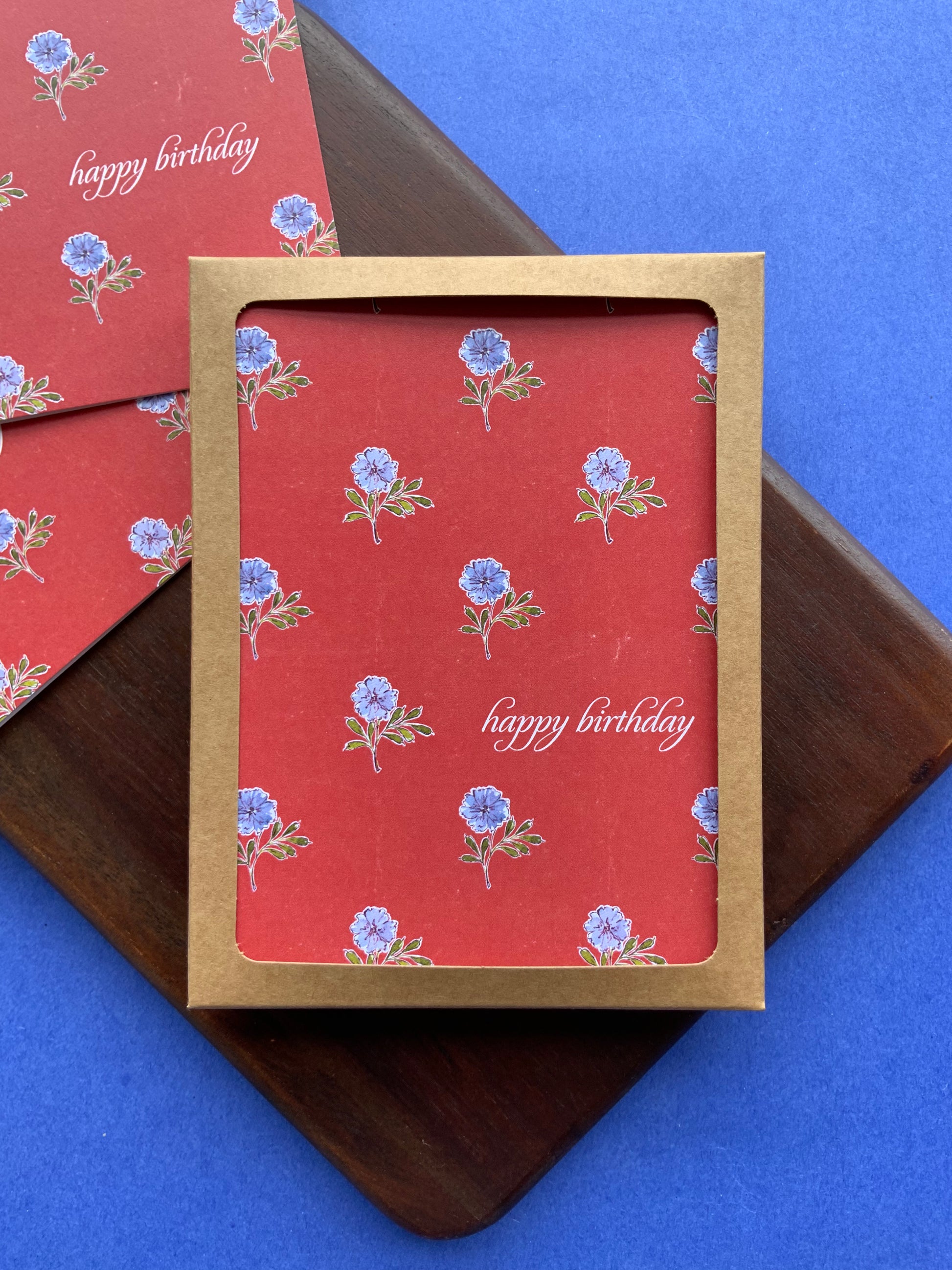 Prepare for the year's birthdays with this stunning floral birthday card, available as either a single birthday card or in birthday card packs of eight cards. The dainty watercolour artwork of purple flowers provides a striking juxtaposition to the rustic red background, with a cursive 'happy birthday' caption adding the finishing touch. The inside is blank for a handwritten message.