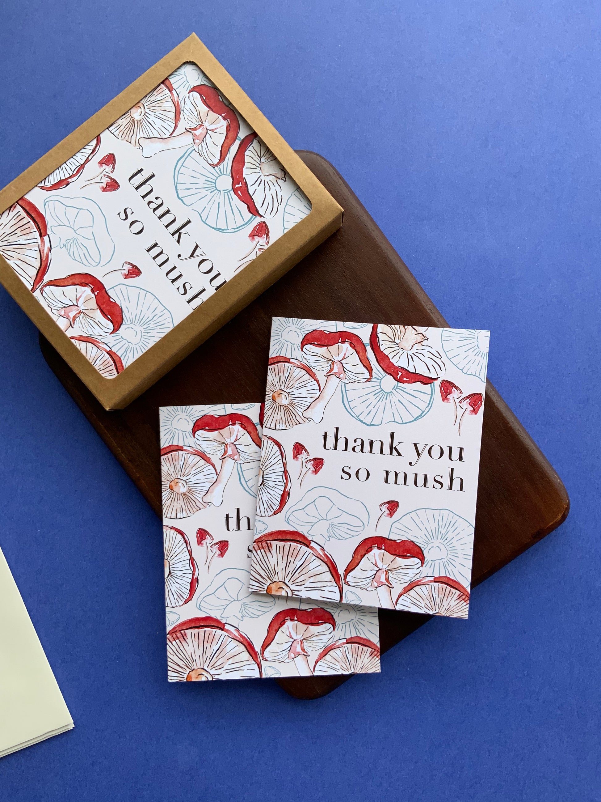 Share your gratitude with a gorgeous handpainted thank you card, with the cheeky greeting card caption "thank you so mush" surrounded by colorful mushrooms. The original watercolor artwork of the toadstools with the pun caption make this the perfect thank you card for sharing heartfelt appreciation without being sappy. Add a handwritten message to the blank inside of the fungi card to personalize.