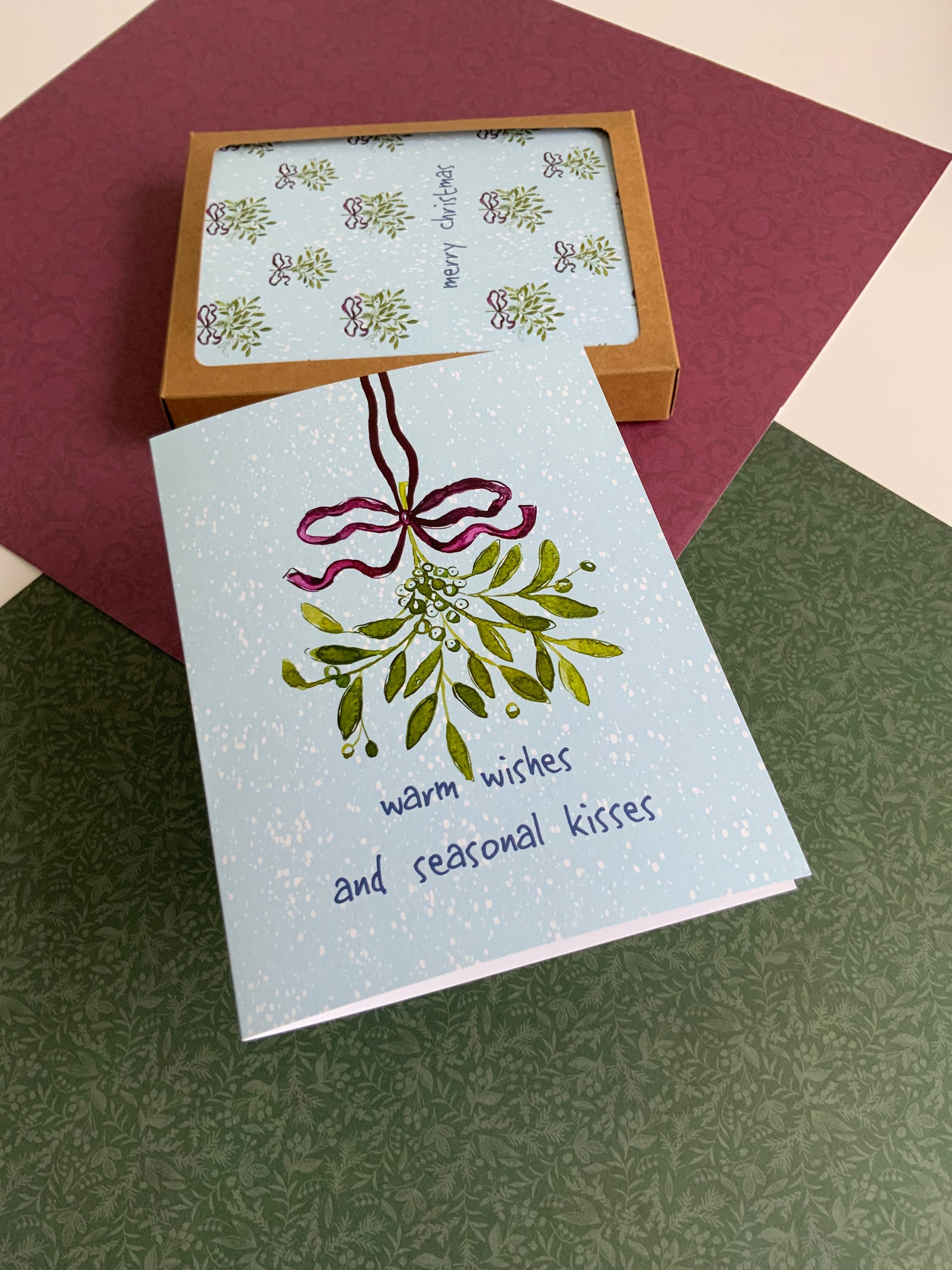 With a luscious sprig of mistletoe tied with burgundy ribbon, this hand painted holiday card is Sending out 'warm wishes and seasonal kisses'! This Christmas card is all about spreading the holiday cheer during the winter chill, bringing our friends and family close and sharing in the festivities. The inside of the seasonal greetings card is blank, so you can write extra warm wishes inside.